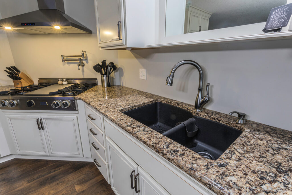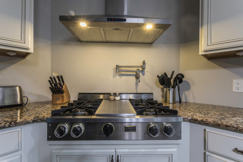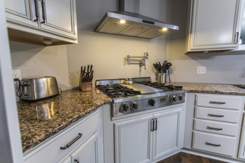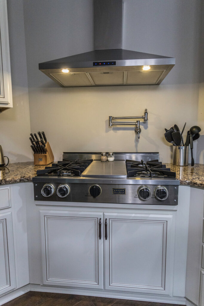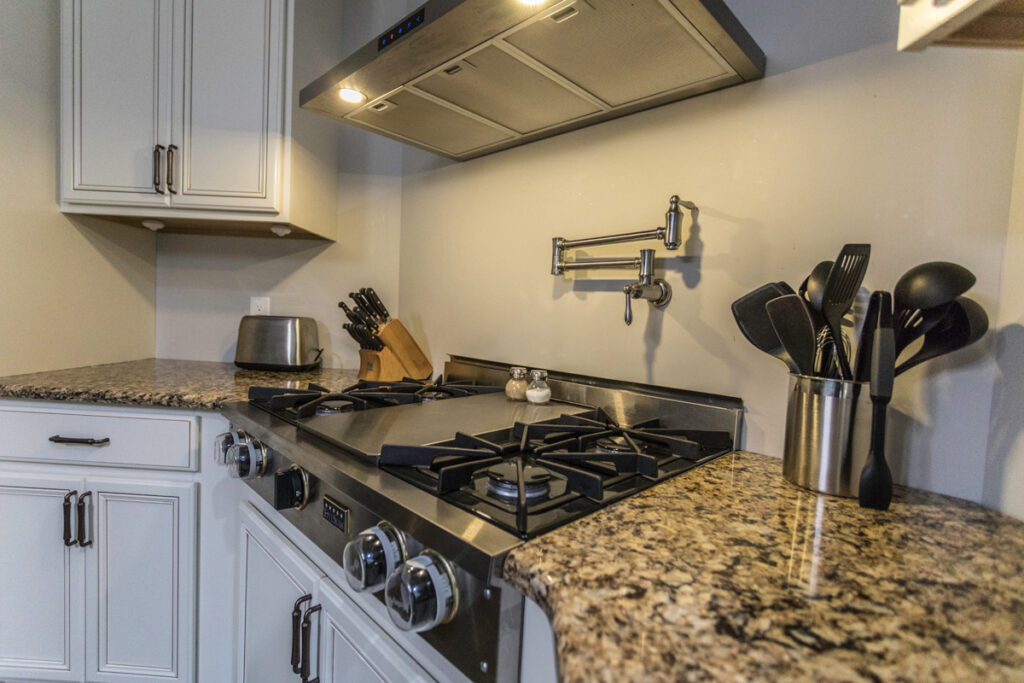 A really cool feature in this kitchen is the pot-filler faucet mounted over the stove. It’s extending arm makes filling up those large pots a breeze. And cooking those large holiday meals has never been better in a beautiful new space to show it off!