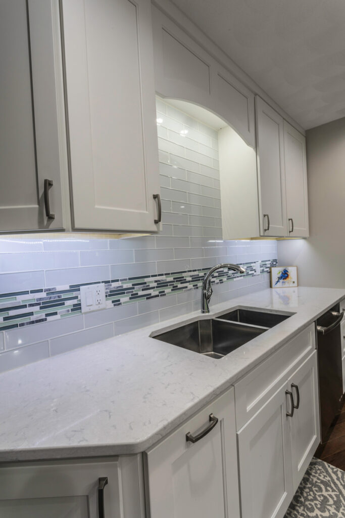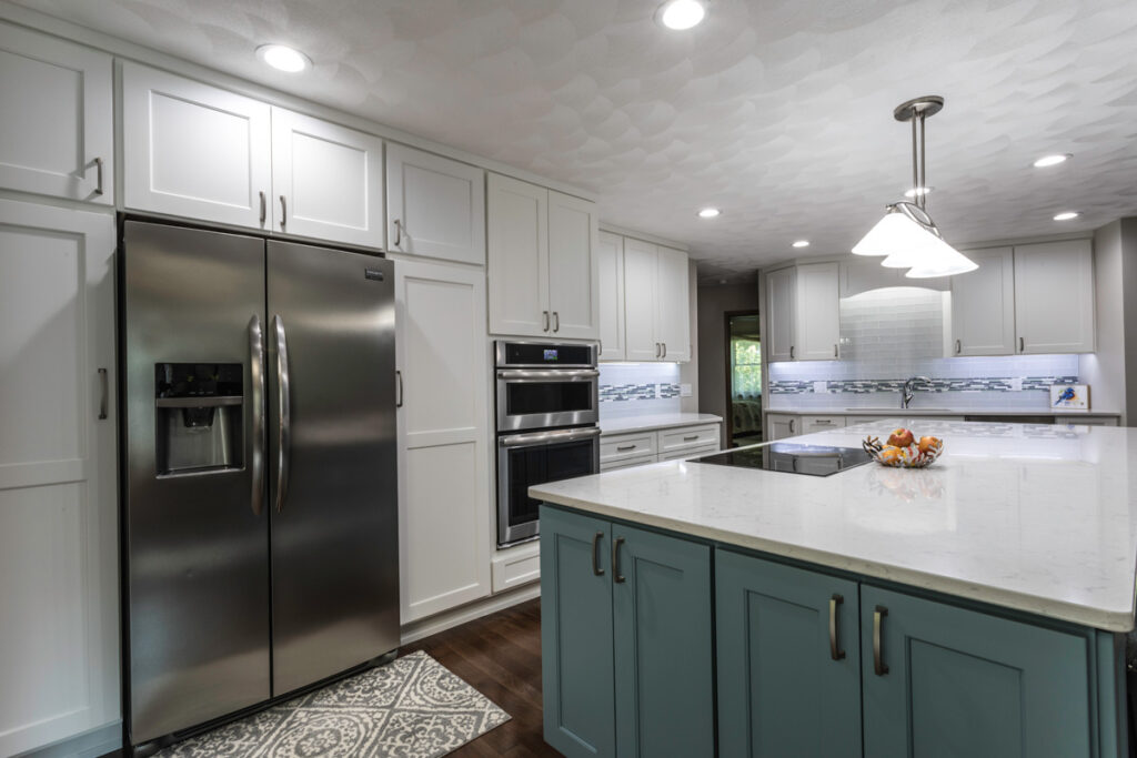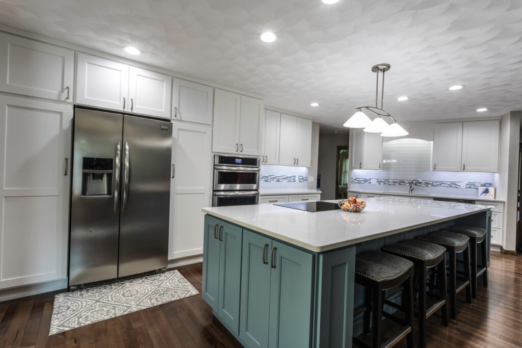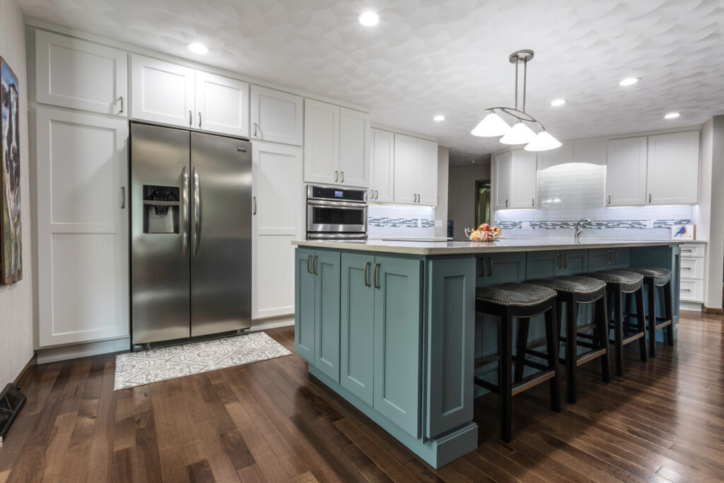 The homeowner chose eggshell white for the perimeter kitchen cabinets. They set off the patterned backsplash with stainless appliances fixtures. The island was done in an “island green” tone that brings in a tranquil splash of color.