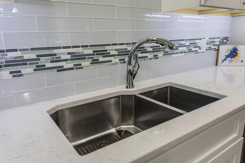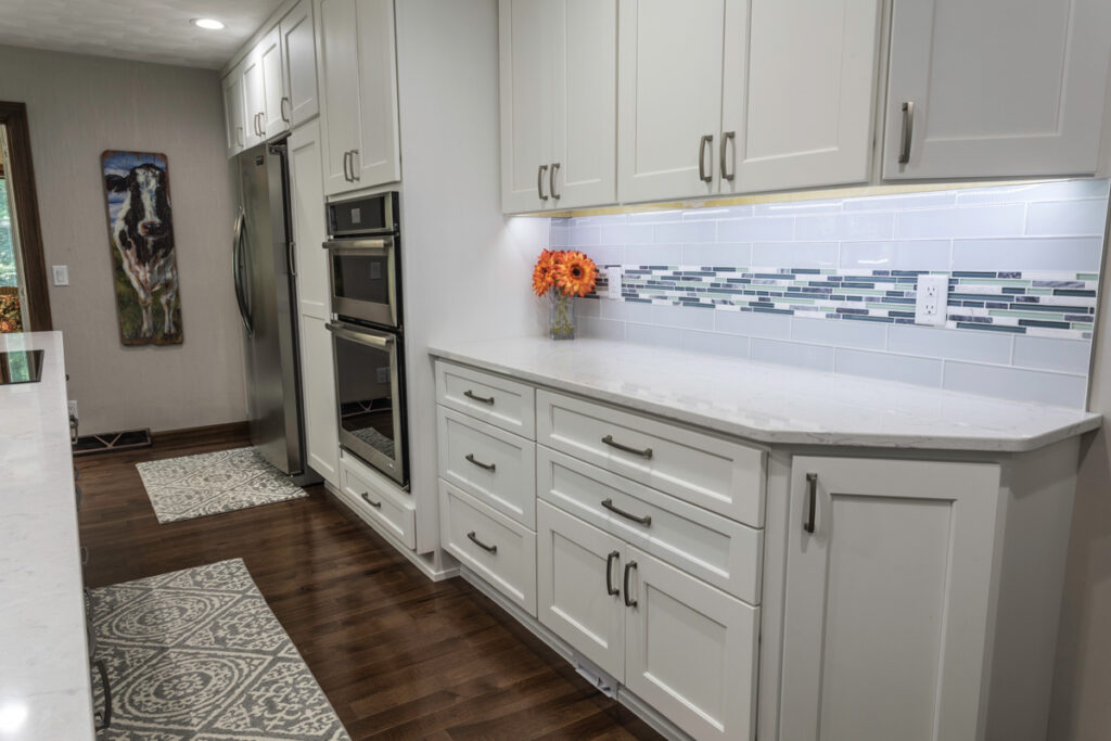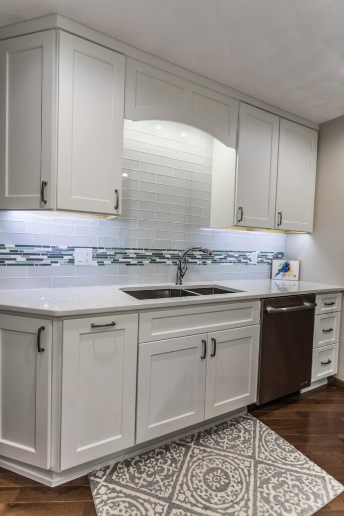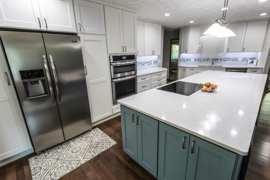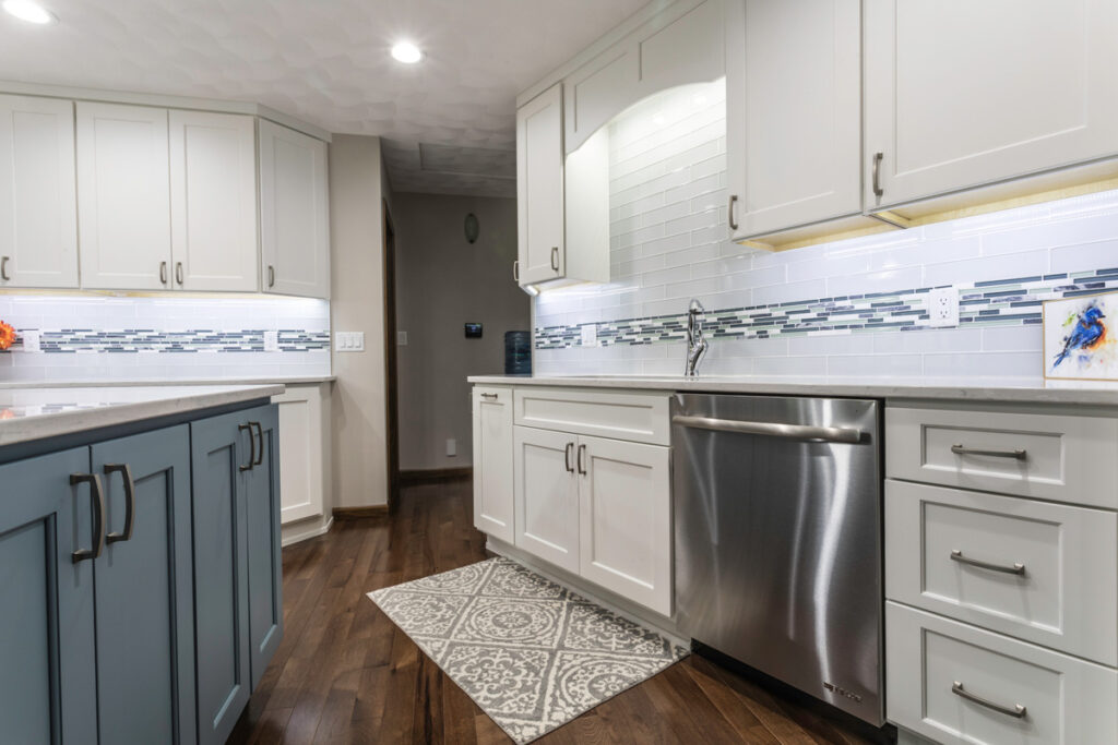 The homeowner chose eggshell white for the perimeter kitchen cabinets. They set off the patterned backsplash with stainless appliances fixtures. The island was done in an “island green” tone that brings in a tranquil splash of color.