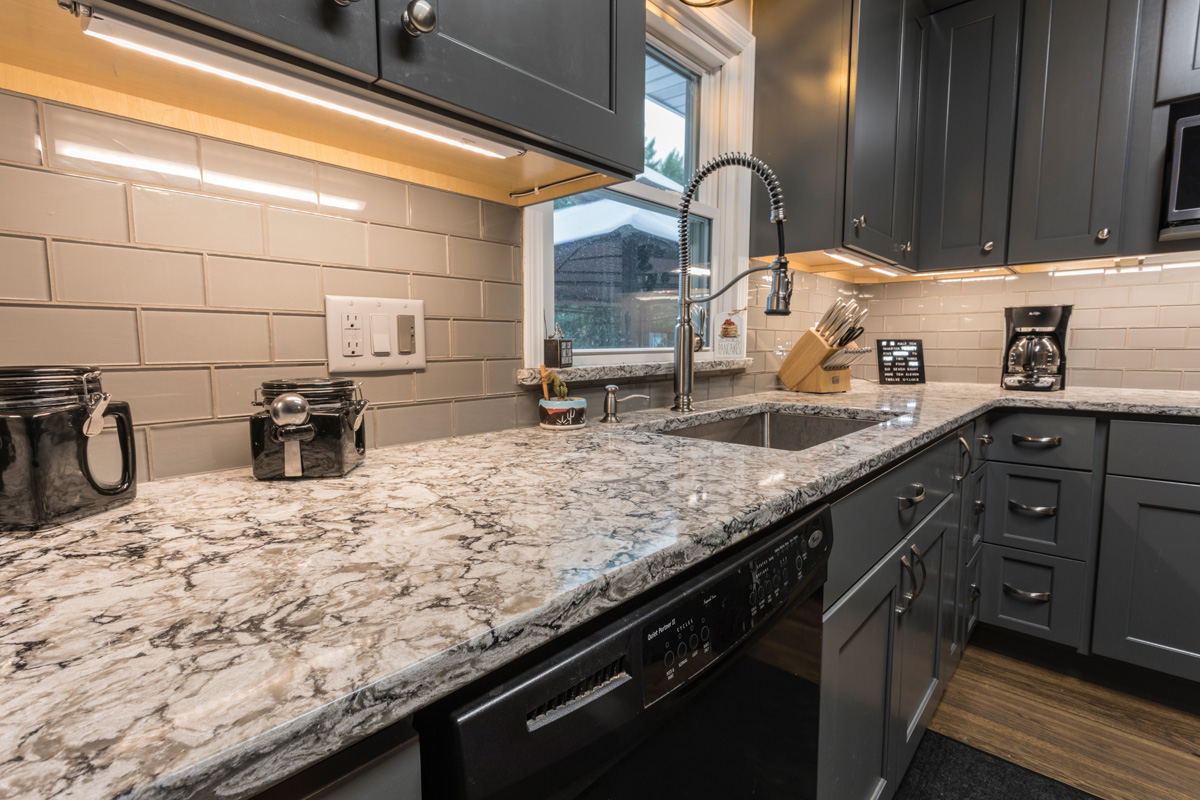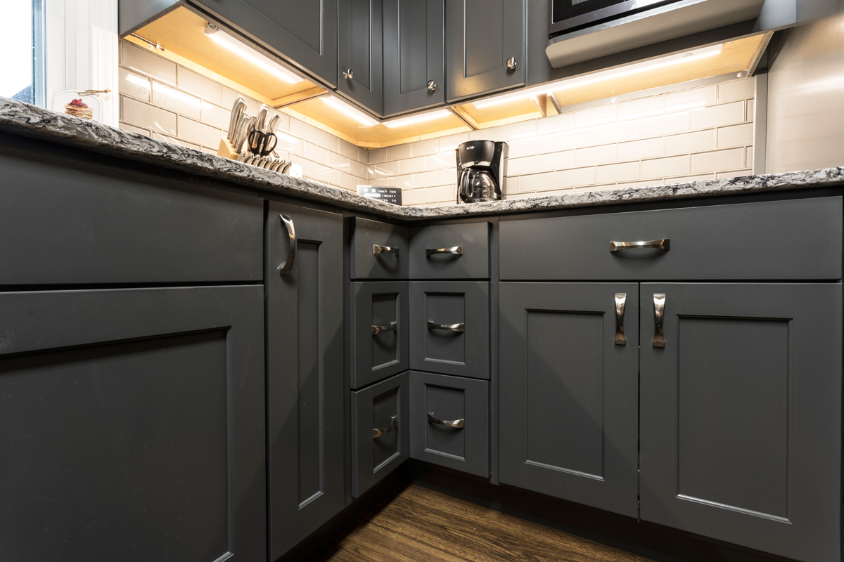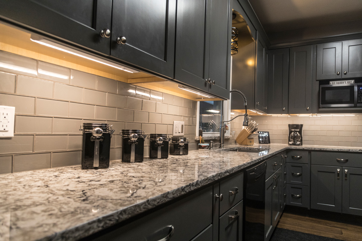 These dark gray cabinets provide a solid base which let the subway tile backsplash really pop!  Undercabinet lighting helps define a perfect workspace. The marble-patterned countertops bring together the grays of the cabinets and the brown tones of the flooring.