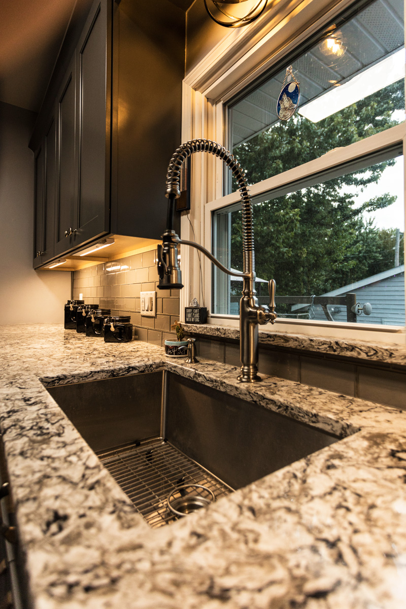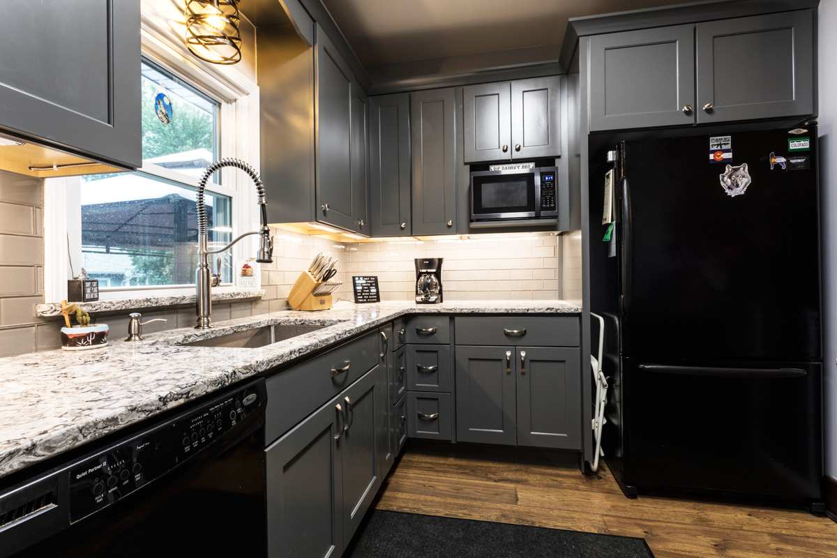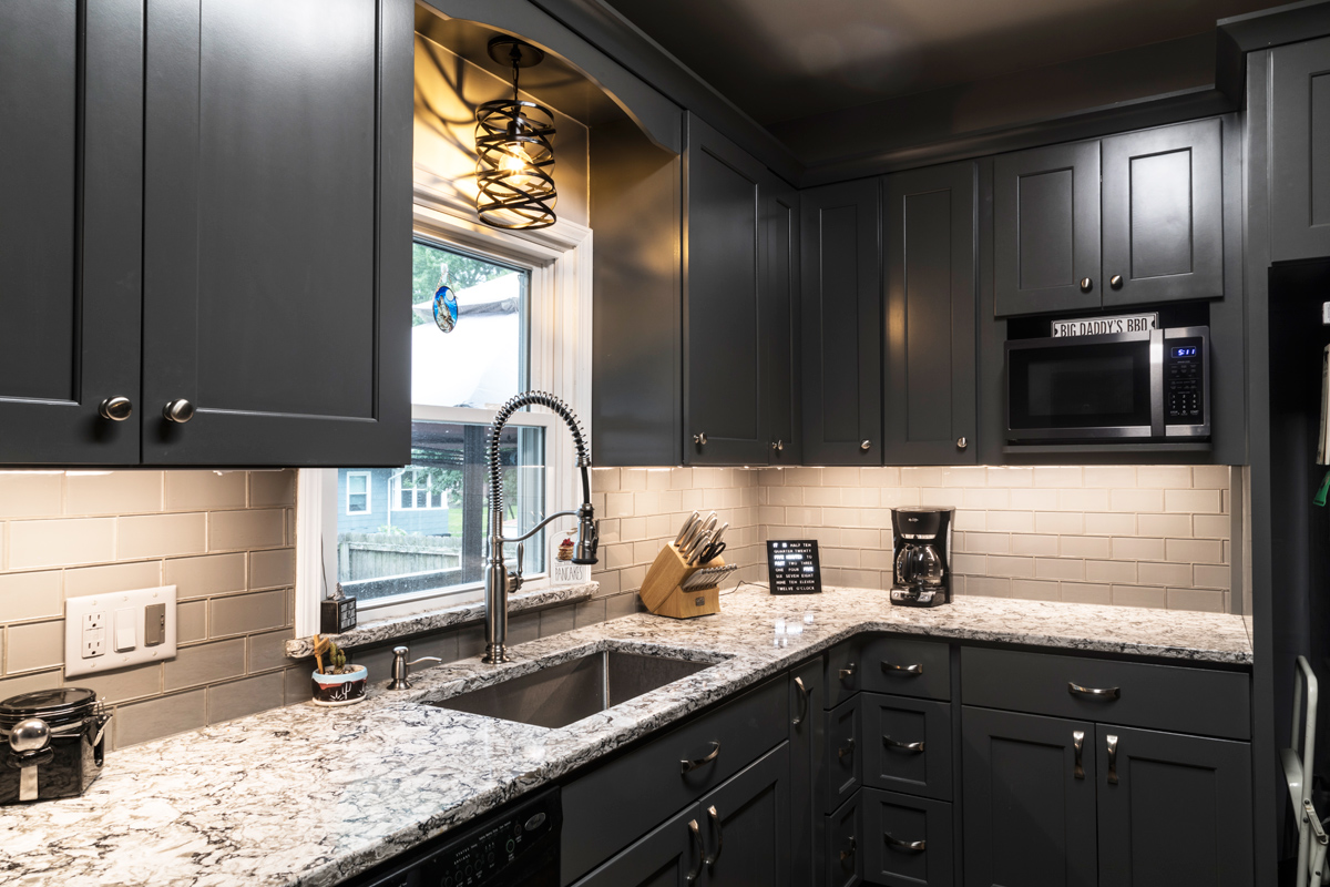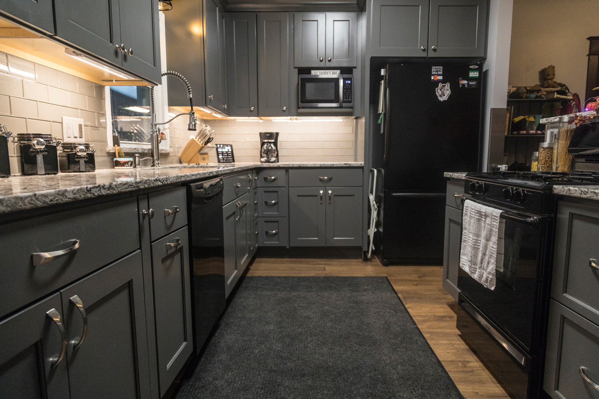 These dark gray cabinets provide a solid base which let the subway tile backsplash really pop!  Undercabinet lighting helps define a perfect workspace. The marble-patterned countertops bring together the grays of the cabinets and the brown tones of the flooring.