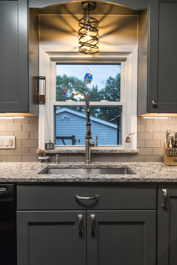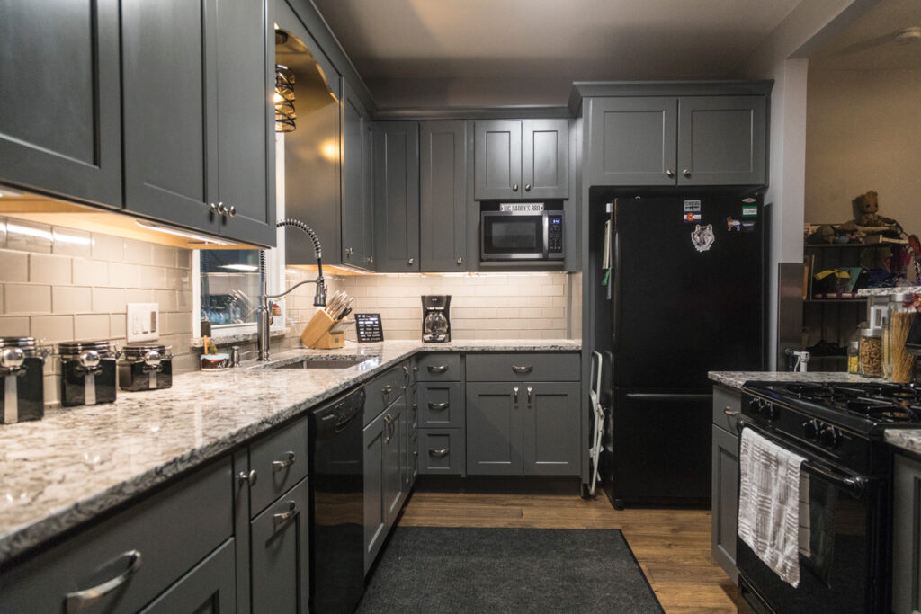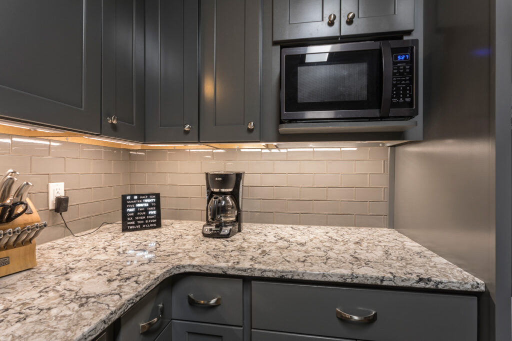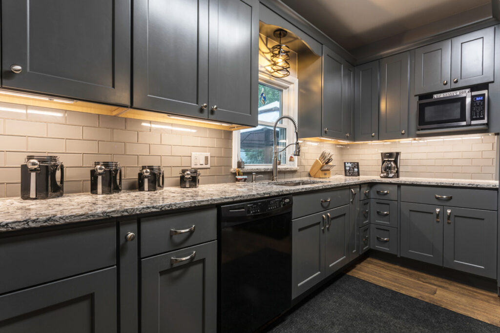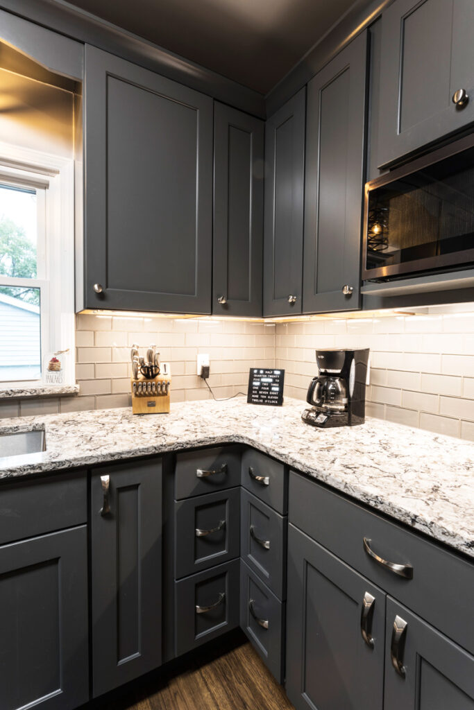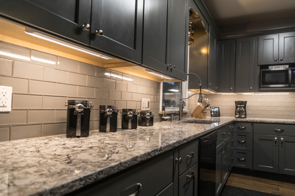 These dark gray cabinets provide a solid base which let the subway tile backsplash really pop!  Undercabinet lighting helps define a perfect workspace. The marble-patterned countertops bring together the grays of the cabinets and the brown tones of the flooring.
