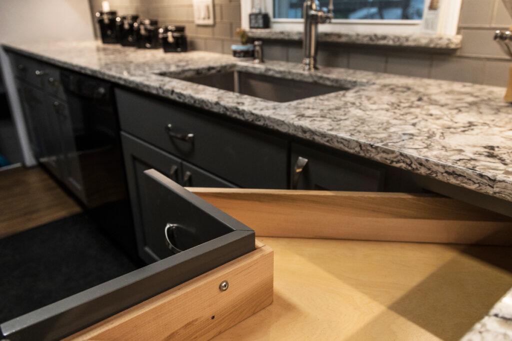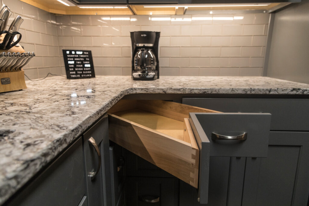A cool feature of this kitchen is the angled corner drawers. These drawers eliminate the need for a lazy Susan, and help maximize storage space.