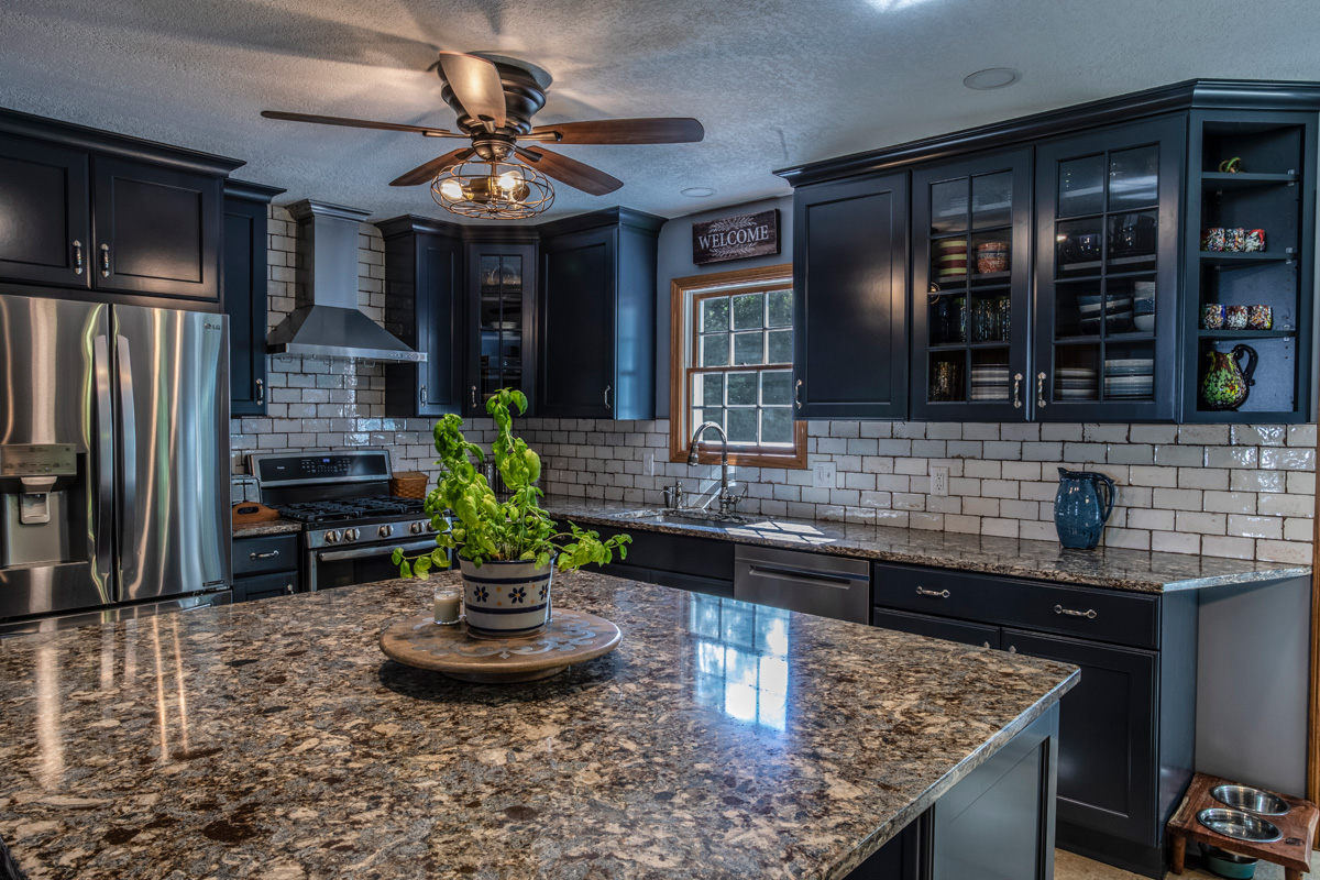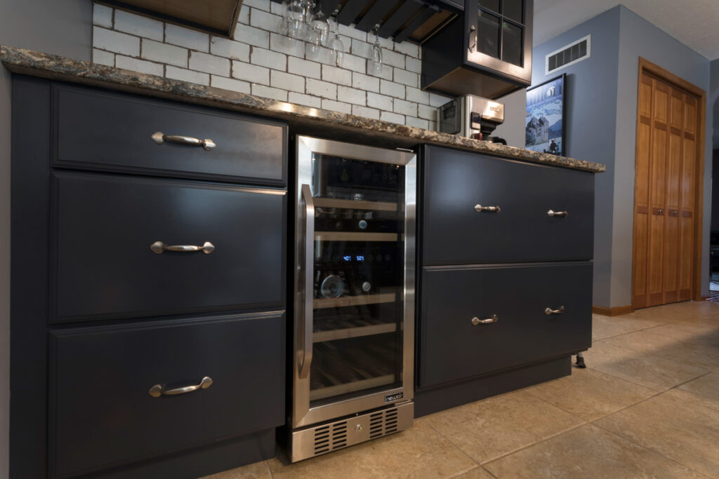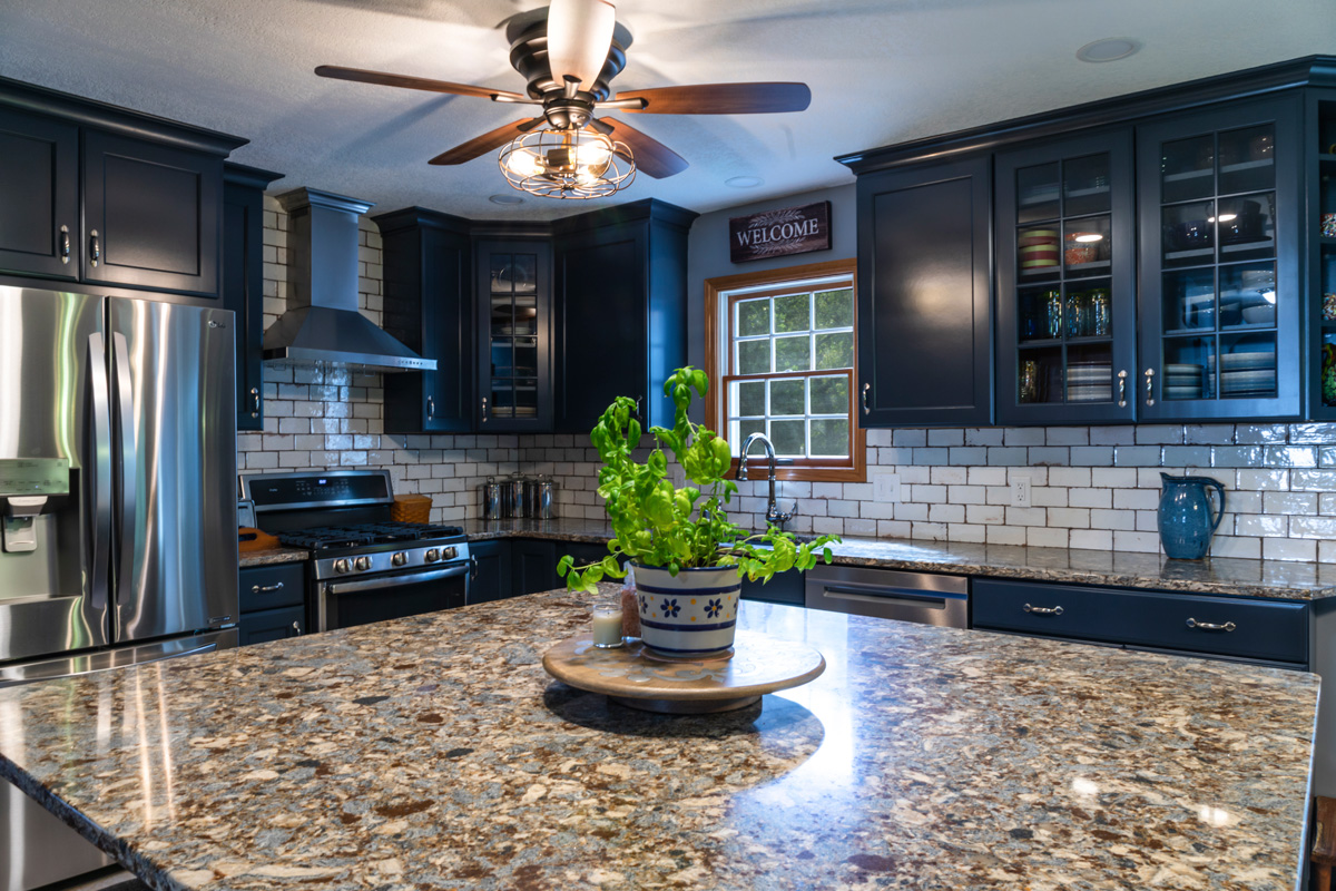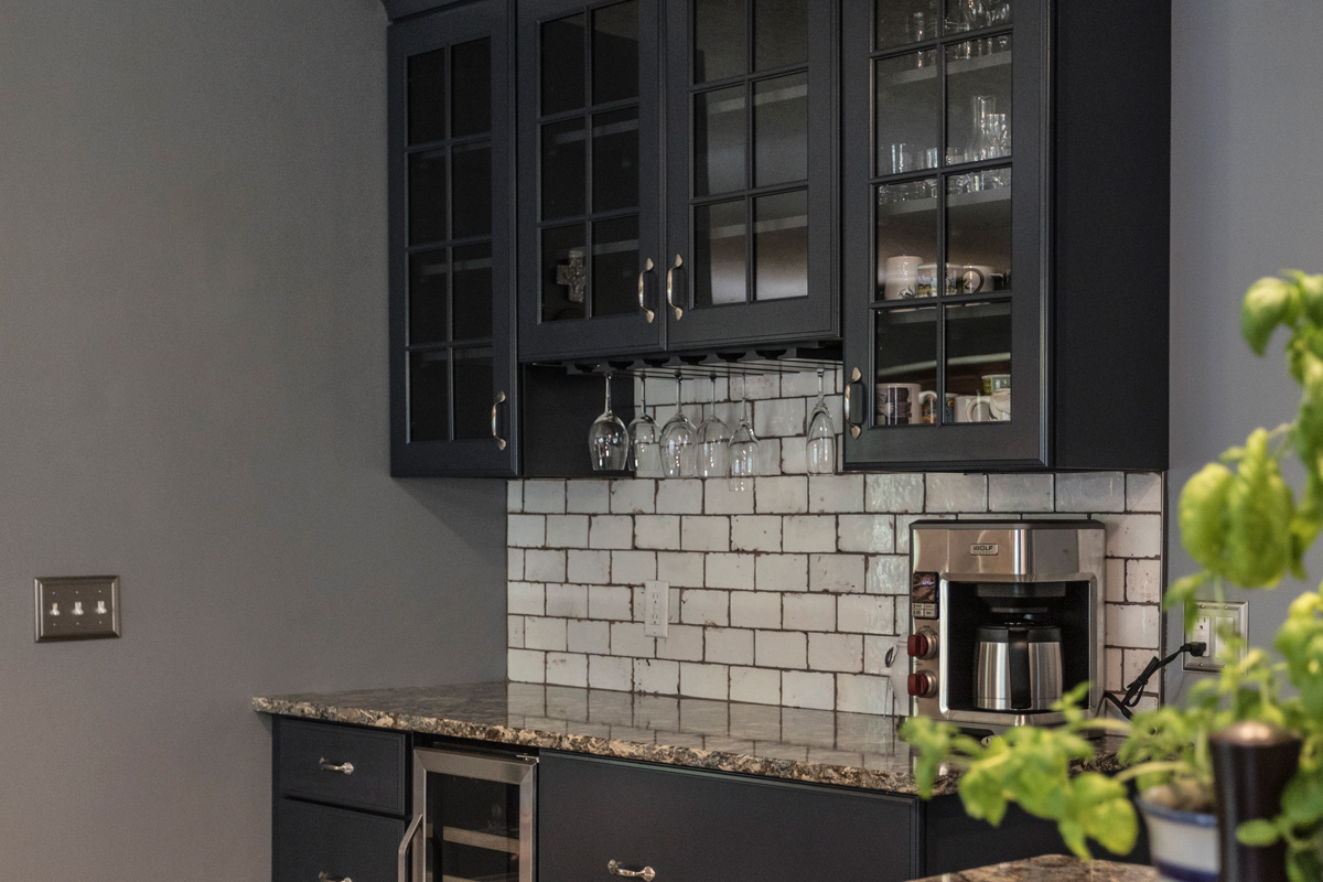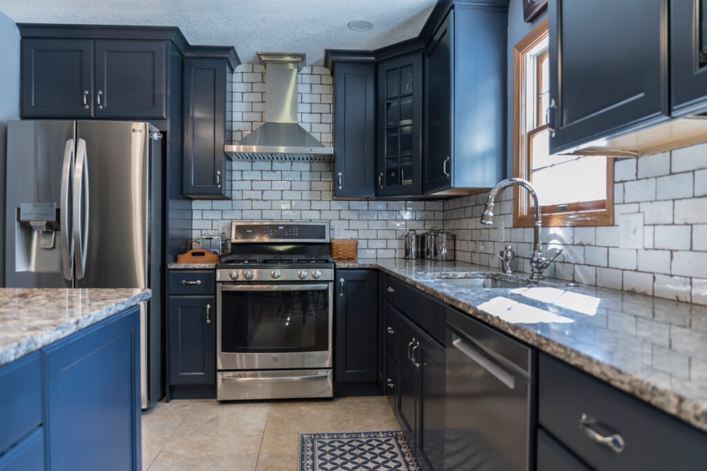 This kitchen was so much fun to design.  To start, the bold navy blue cabinets provide such a moody backdrop to the design.  Paired with the rustic-style subway tile backsplash, it gives a European appeal.