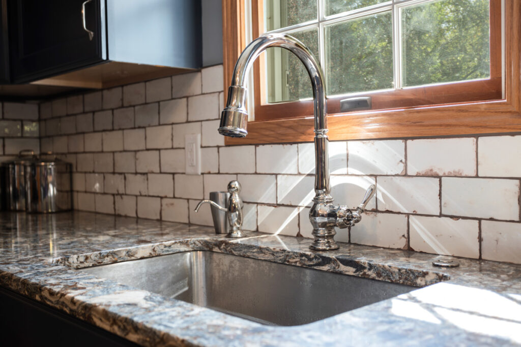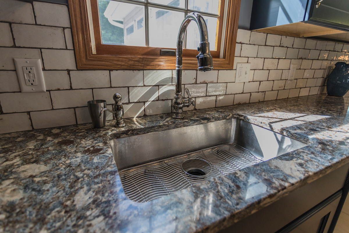 The countertops bring in several tones from the room, including the browns from the wooden trim and accessories chosen to compliment the space.