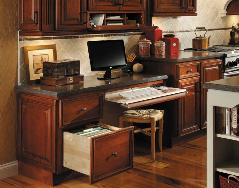Slim office components provide you with the convenience and functionality of a dedicated office using limited space in your kitchen.