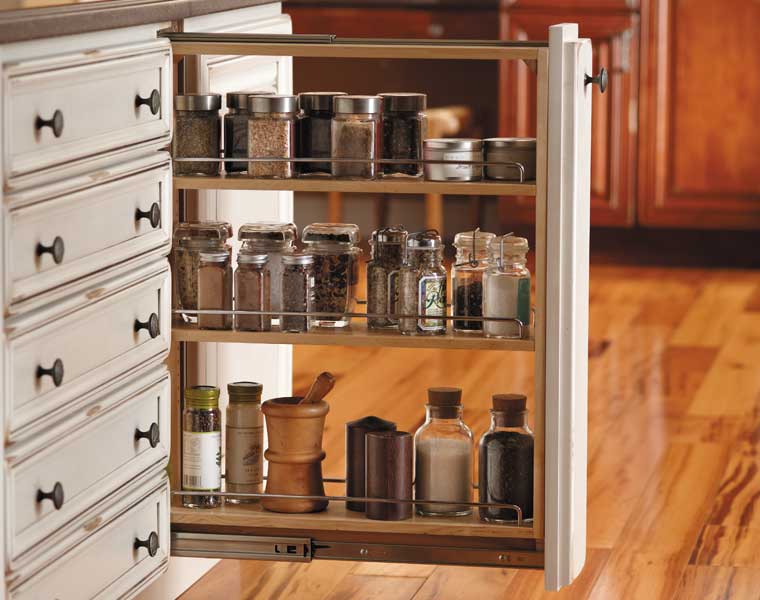 Pull out storage allows you to make the best use out of narrow spaces. Available configurations include spice racks, peg boards, small bins and many more.