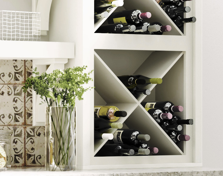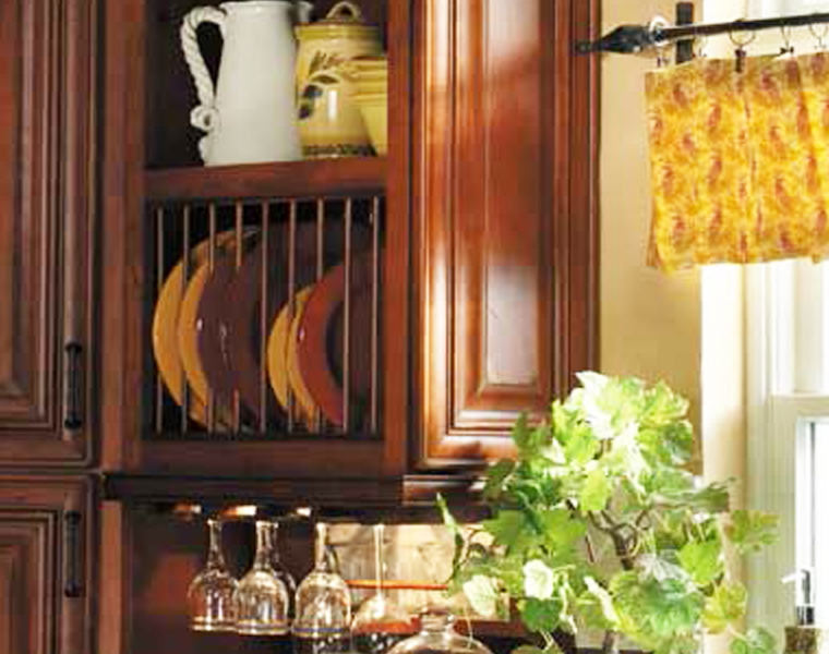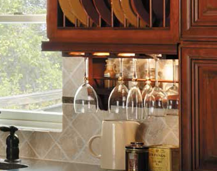 Under cabinet slide in glass rails add storage and style. They’re a great way to display your beautiful crystal while keeping it close to hand.