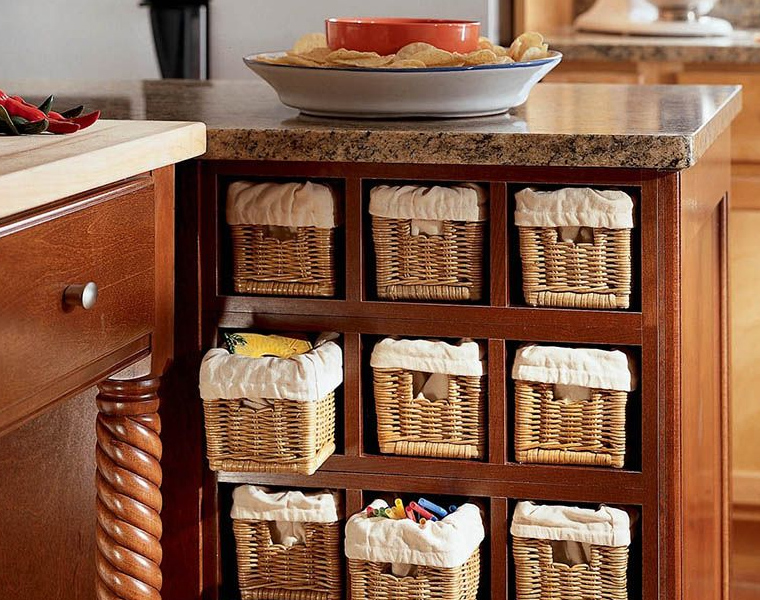 Base cabinet basket storage comes in a variety of sizes and configurations for kitchen and bathroom and can store anything from fruits and vegetables to towels and linens.