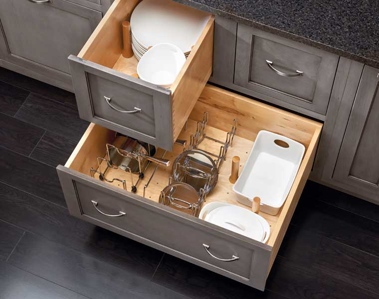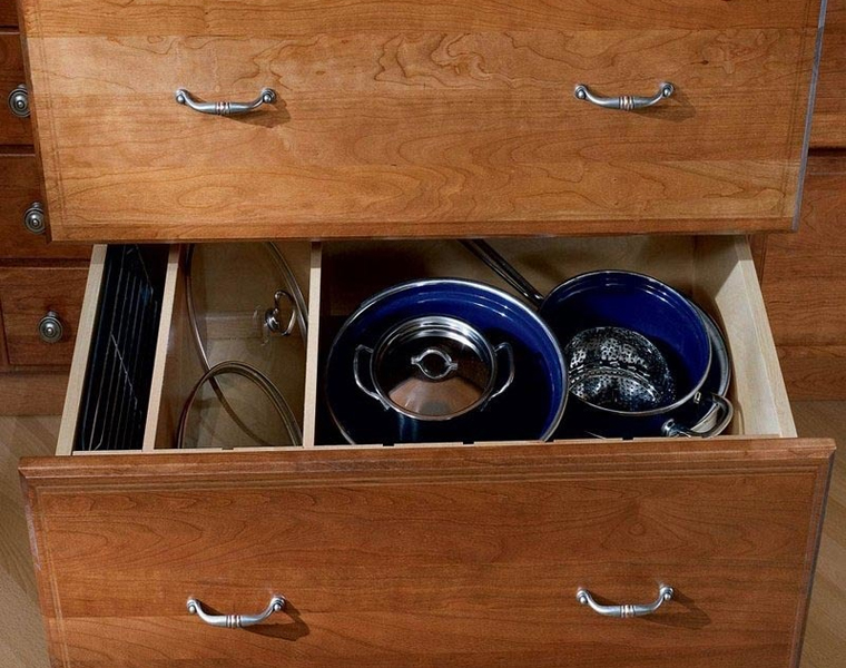 Deep drawers and high sides make pot and pan storage a snap. You can further reduce clutter with peg or partition organizers in each drawer.